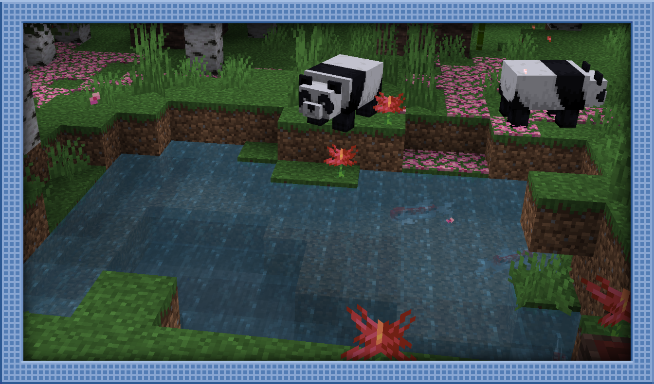 The biome also has plenty of wildlife, including Pandas, Deer, and Koi! Deer can be found wandering in all forest biomes and will give venison when killed. Feeding a deer a glistering melon and then a flower will cause the deer to spread that flower nearby. Koi fish will prevent hostile mobs from spawning nearby!