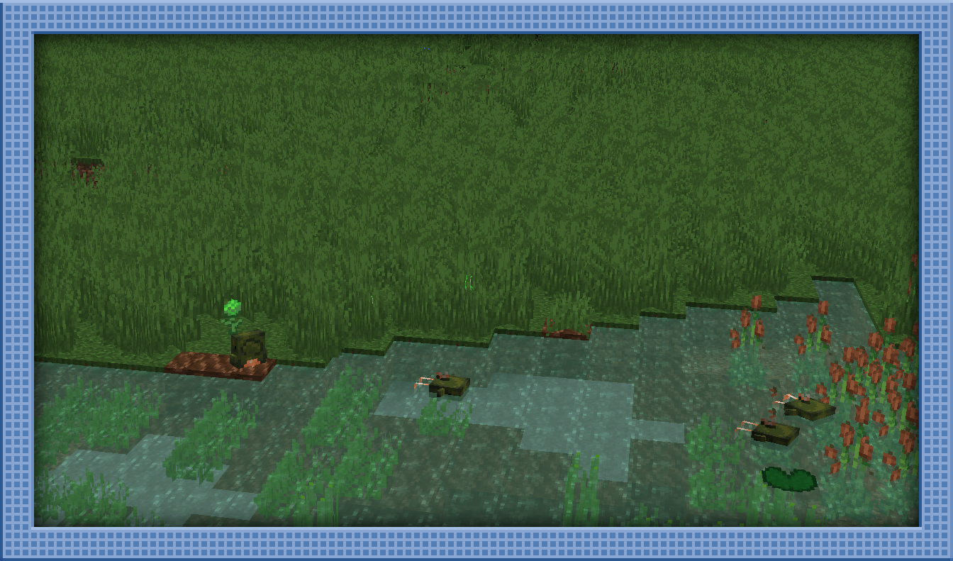 Marsh biomes can also be found usually near Swamps. These grass-covered landmasses have their own special natural Slabfish variant, as well as a exclusive green flower! Plenty of mud, cattails, and rice can be found here, but be careful, mobs could be hiding within the very dense giant tall grass! Rarely, giant brown mushrooms can be found here.