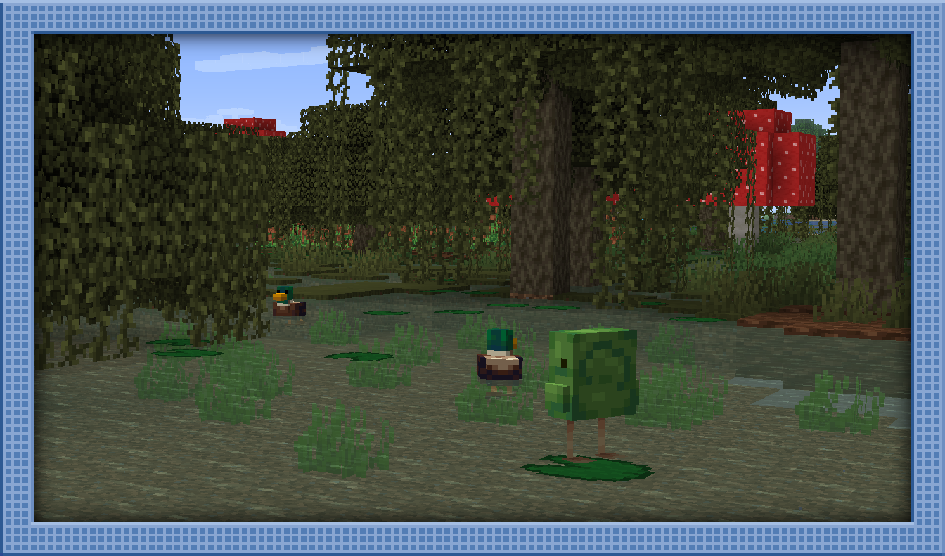 Swamps have a lot of content now, most of it originating from Swamp Expansion. Slabfish and Duck can be found, as well as Willow Trees and Cattails. Giant Mushrooms also can generate in Swamps, like in Bedrock edition. Eventually, Giant Lily Pads will also generate there! Ducks and Cattails can also be found around River biomes