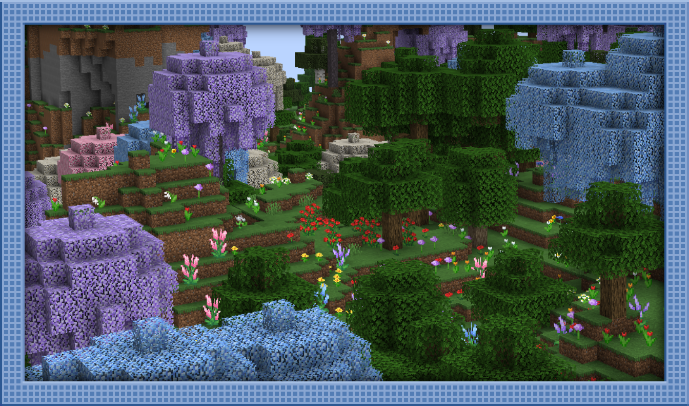 Flower Forests still have the colorful Wisteria Trees from Bloomful, as well as various different new flowers and such. Delphiniums and Cartwheels are both flowers exclusive to this biome!