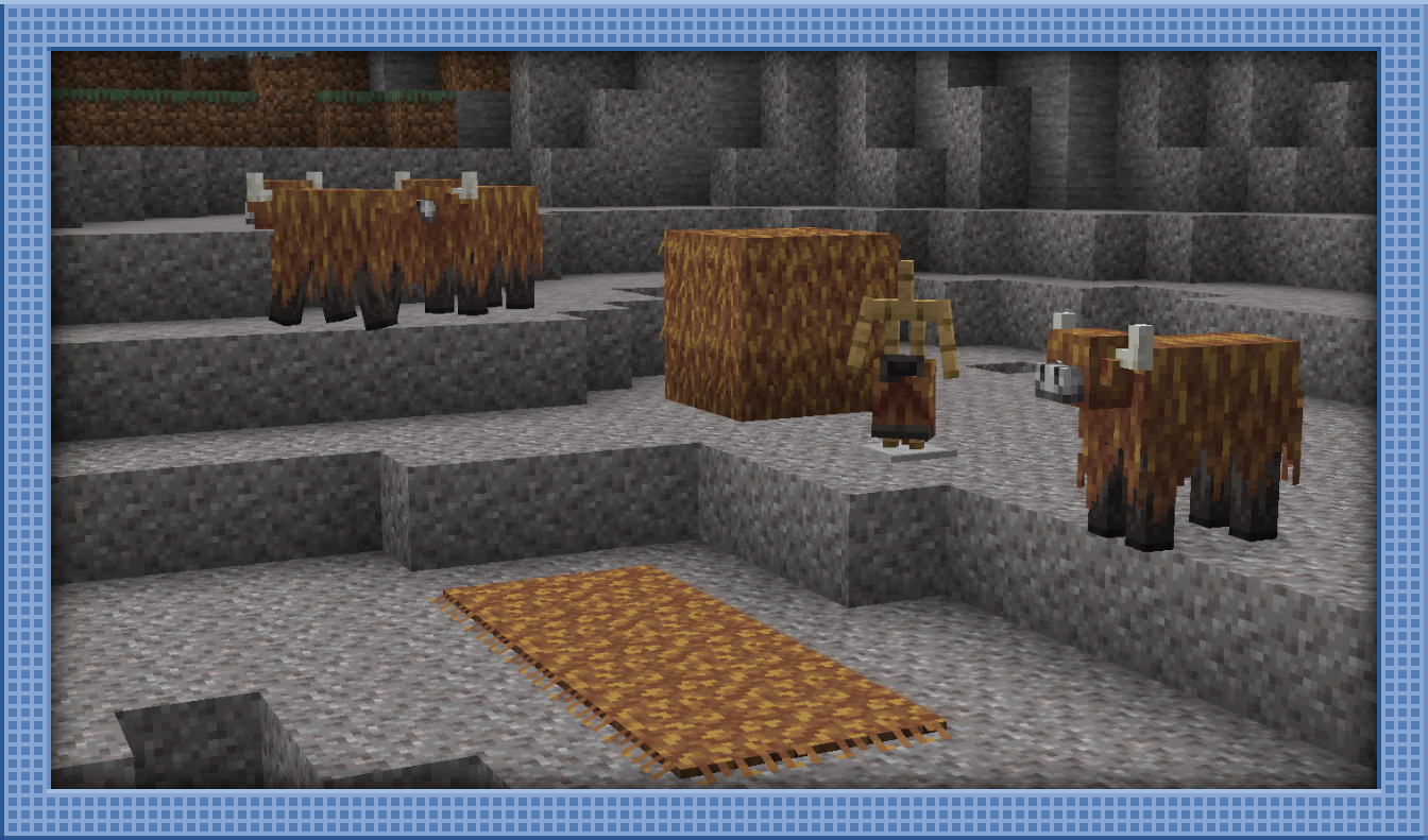 Yaks are a fluffy new creature found wandering Mountain biomes! Shearing them will give you a tuft of their hair, which can be used to make brown wool, yak hair blocks, yak hair rugs, or even a new piece of leggings, called Yak Pants! Yak Pants allow the players to walk up blocks like horses, and buffs any mounts the wearer rides.