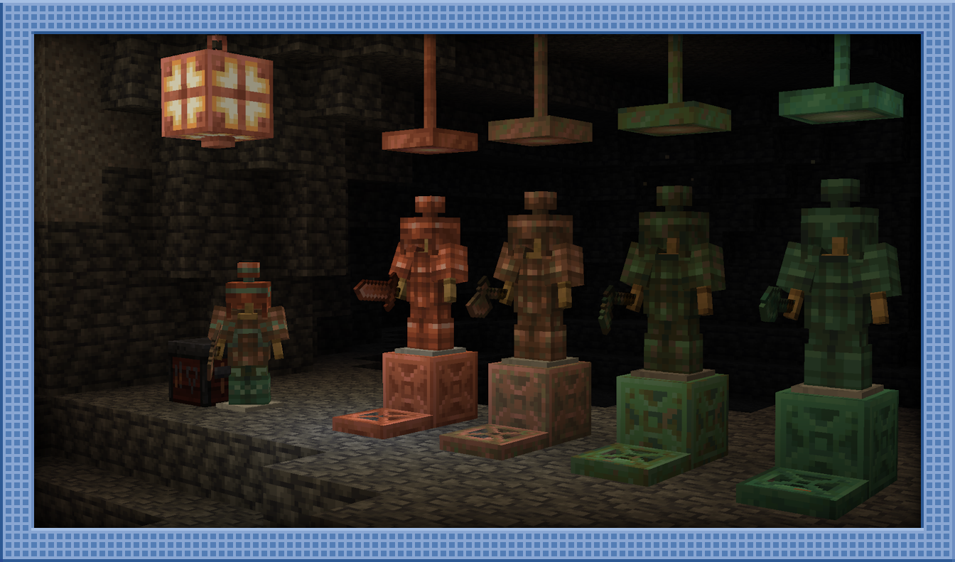 We’ve implemented our own take on Copper Tools & Armor, focusing on justifying their existence and place in the game with unique mechanics and visuals! They have a bulkier design than Vanilla’s, as they are now made from Copper Blocks instead of Ingots, because their main mechanic is a massive increase in durability, past all other tiers. They also now slowly oxidize when equipped/held, and can be waxed.