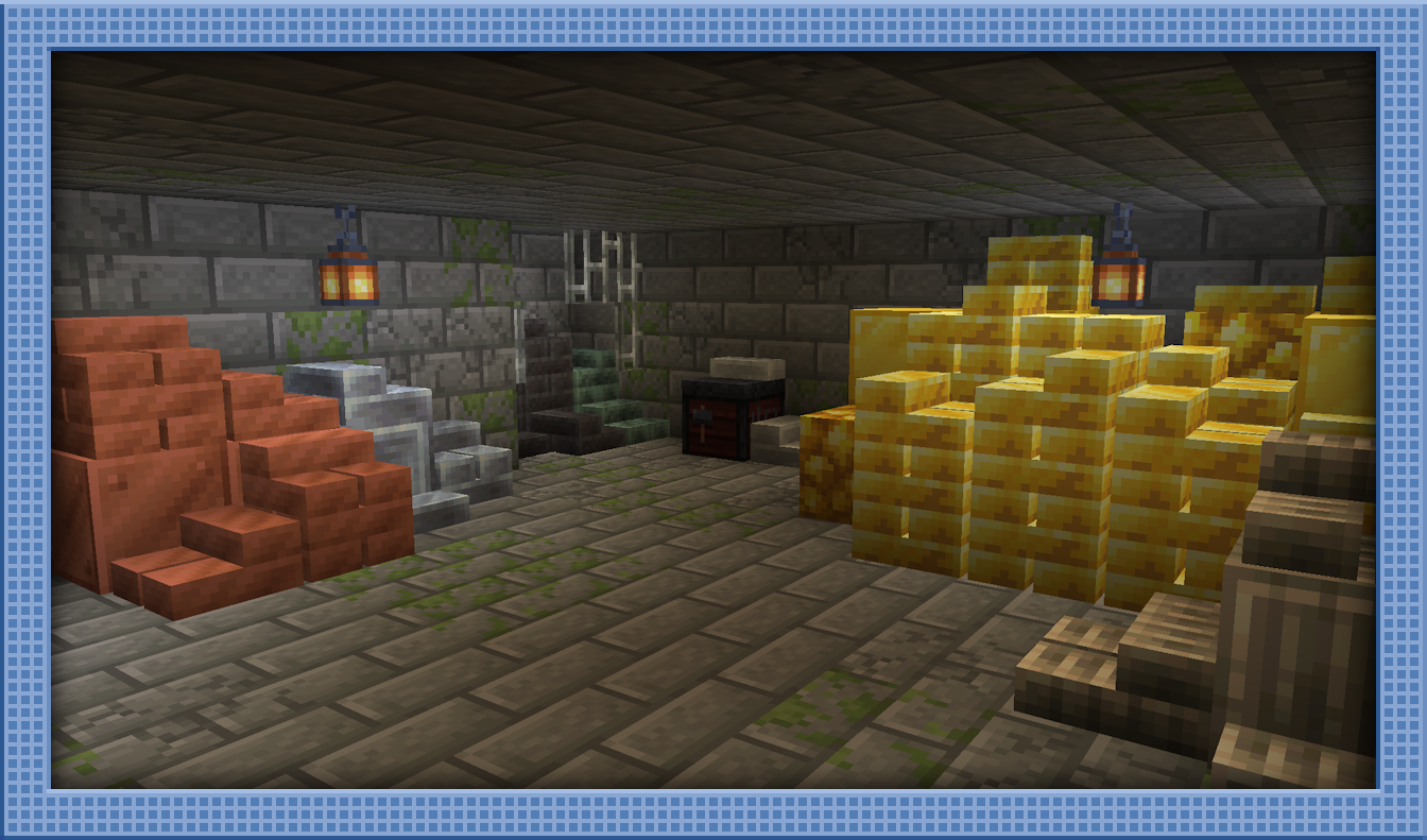Vaults are new underground structures found quite rarely in the depths of the world! These are small boxes with a few randomized piles of ingots and ore blocks, making for a lot of riches to collect! A couple of chests will also be found, with a mixed pool of various loot items like more ingots, gems, golden apples, and other rare items! These structures have quite a lot of valuables, but will be hard to find due to their rarity and because they generate with almost no air/cave exposure!