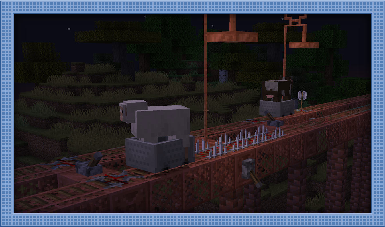 Spiked Rails have also been changed to damage entities solely outside of the minecart, rather than within. Although mobs do, of course, avoid rails anyway, keen minecart aficionados will be familiar with the fact that isn’t always enough. The old spiked rail functionality of hurting entities within minecarts has been moved to the new Slaughter Rail!