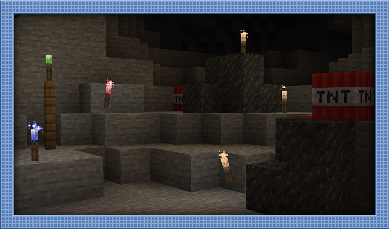 Sparklers are a new light source, similar to a torch, crafted with a Stick and Gunpowder, and create passive sparkling particles. They have to be lit manually with Flint and Steel, and lighting them a second time (or sometimes colliding with them) will cause a small, non-destructive explosion of particles. Sparklers can be dyed in all sixteen dye colors for some awesome building opportunities!